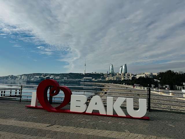 Man kann sehr weit laufen unter der stechender Sonne aber ist auch angenehm windig. Carpet Museum, Klein Venedig mit Gondeln fahren lassen, Kakteengarten, Pier, sehr breite Promenade, viel Platz, Parkanlage und diverse Elemente und Akzente wie ein alter russischer Turm aus Stahl, Karussell, Cafes, Shoppingcenter mit Kino, und mit dem Funicular sogar hoch fahren und die Aussicht über die Stadt geniessen