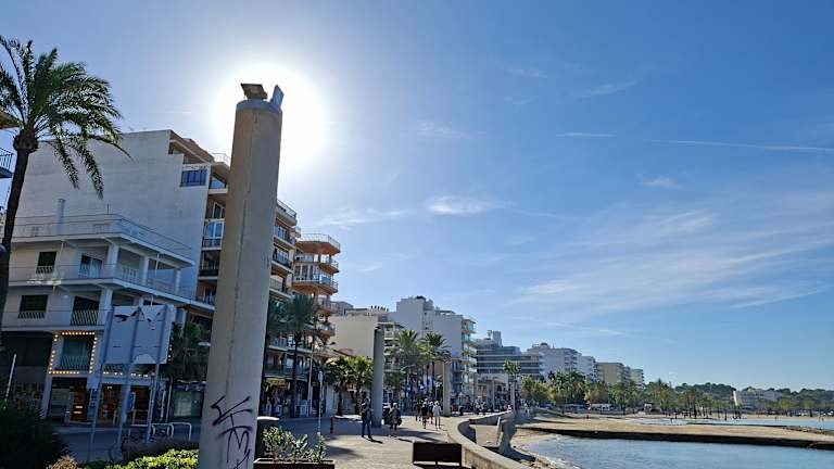 Die schöne, flache, lange und relativ breite Strandpromenade der Playa de Palma lädt zu kürzeren oder längeren Spaziergängen ein – oder man setzt sich irgendwo hin und blickt entspannt zum Meer (z.B. beim Sonnenuntergang). Bei unserem Urlaub an der Playa de Palma waren wir jeden Tag mindestens einmal an der Strandpromenade und obwohl das Wetter Ende Februar meistens nicht besonders gut war, genossen wir unsere Aufenthalte an der Promenade.