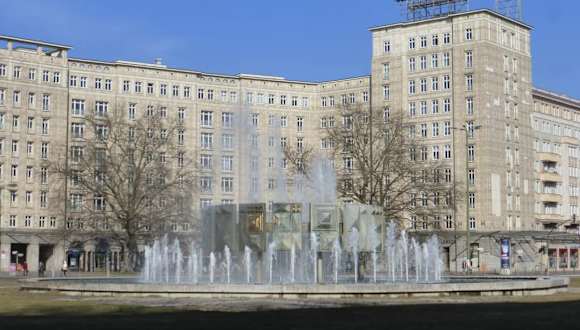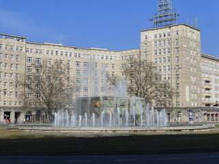 Der Strausberger Platz in Berlin-Friedrichshain / Berlin-Mitte liegt an der Karl-Marx-Allee. Hier befand sich einst der Hinrichtungsplatz von Berlin. Im Zweiten Weltkrieg wurde die ganze Umgebung zerstört. Nach dem Krieg wurde unter direkter Leitung der DDR-Führung mit dem Bau von neuen, dringend benötigten Wohnhäusern im sogenannten Sozialistischen Klassizismus begonnen. Im Zentrum des beeindruckenden Platzes steht ein reich verzierter, mächtiger Springbrunnen. Die Gebäude am Strausberger Platz sind mit aufwendigen Fassaden versehen. Hier befindet sich Schnittpunkt der von Ost nach West verlaufenden überbreiten Karl-Marx-Allee (einst Stalinallee) mit der von Nord nach Süd verlaufenden Lichtenberger Straße. Restaurierungsarbeiten des Strausberger Platzes und der Karl-Marx-Allee sollen dieses Gebiet in eine Einkaufsstraße verwandeln – unter Erhalt der inzwischen unter Denkmalschutz stehenden Gebäude.