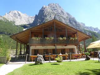 Die traumhafte Lage, der Talschlusshütte am Ende des romantischen Fischleintales ist schon einen Besuch wert. Die Talschlusshütte befindet sich auf einer kleinen sonnigen Waldlichtung. Hier war es schon schwieriger einen Platz im Berggasthof auf der Terrasse zu finden. Wir hatten mal wieder Glück und fanden einen schattigen Platz auf der Sonnenterrasse. Nach ca. 10 Minuten kam die freundliche Bedienung und brachte uns die Speise- und Getränkekarte. Wir haben dann gleich 1 Portion Eis (3 Kugeln), 1 Tasse Kaffee und 1 Buchweizenkuchen mit Sahne bestellt. Eis, Kaffee und Kuchen wurden uns von der Kellnerin trotz der vielen Gästen bereits nach kurzer Zeit serviert. Leider war mein Buchweizenkuchen etwas zu trocken. Sehr schön fand ich auch die holzgetäfelte Gaststube und die Theke von der Talschlusshütte. Originell fand ich in der Gaststube, den hängenden Bergsteiger mit Seil. Interessant und informativ fand ich die Informationstafeln im Außenbereich von der Talschlusshütte. Da wurde auf zwei Schautafeln mit Bildern, die Alpengeschichte von großen Abenteurer und Klettermeistern in den den letzten 150 Jahren beschrieben. Auf einer anderen Tafel wird die Geschichte der Entstehung der Talschlusshütte durch Siegfried Villgrater erzählt. Auch gab es einen sehr urigen großen Kinderspielplatz mit einer hölzernen Pferdekutsche, Neben dem Spielplatz befand sich auch ein Biotop. Auf der Wiese des Biotops tummelten sich einige Hasen. Das schönste auf der Talschlusshütte ist die traumhafte Aussicht zu den Gipfeln der Sexterner Dolomiten mit ihren schroffen Felswänden, ein weltweit einzigartiges Naturschauspiel. Bergsteigerlegende und Filmregisseur Luis Trenker hat einmal behauptet, dass das Fischleintal der schönste Fleck im schönsten Tal der Welt sei.