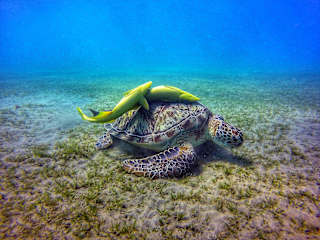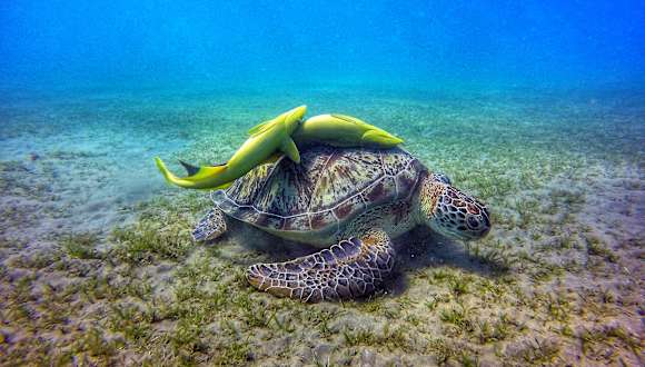 Hier in Abu Dabbab gibt es viele Schildkröten, die sich an der Seegraswiese laben, samt ihren Putzerfischen. Dazu im Riff die breite Palette der typischen Bewohner des roten Meeres: Blaupunktrochen, Feuerfische, Igel- und Kugelfische, ... Immer wieder ein Erlebnis :)