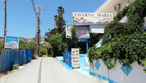 Bei Maria ist es lecker und hausgemacht und abwechslungsreich. Bei Maria ist man willkommen, wird umsorgt und bestens verpflegt. Bei Maria kann man lachen, die Sprache ausprobieren, sich als Gast bei einer Familie fühlen. Bei Maria kann man beim Speisen und quatschen, aufs Meer sehen, zwischendurch einen Snack nehmen, Frappe trinken oder ausgeibig essen, mit so vielen Tellerchen, daß der Tisch fast nicht ausreicht. Bei Maria gibt es u.a. leckeren Wein aus Embonas von einem Bauern - lecker. Also wir gehen dort wieder hin. Versprochen.