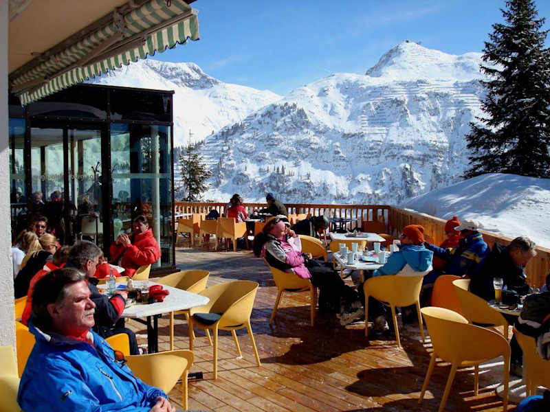 An den Pisten von Lech gibt es eine Vielzahl von guten Einkehrmöglichkeiten, um bei einer Mittagsjause in der Sonne wieder Kraft zu tanken. Besonders positiv ist mir die Sonnenterrasse des Hotel Burgwald in Oberlech aufgefallen: Hier sitzt man nicht nur sonnig, windgeschützt und gemütlich direkt an der Piste, sondern kann auch in einer umfangreichen Speisekarte wählen, die neben den üblichen Spezialitäten feine österreichische Küche anbietet. Der Service ist flink und sehr freundlich, absolute Referenzklasse! Meine Kässpätzle kamen in einer glühend heißen Gusspfanne mit einem frischen Gartensalat und waren ein Gedicht. Die Mengen an gratiniertem Käse und Röstzwiebeln suchen ihresgleichen – gut, dass man die Kalorien anschließend auf der Piste wieder umsetzen kann... Und der Espresso nach dem Essen hätte auch in Italien nicht besser geschmeckt! Wer statt auf einer überfüllten Hütte lieber auf ruhige Gastlichkeit setzt, ohne dafür das Skirevier verlassen zu müssen, dem sei die Terrasse des Hotel Burgwald sehr empfohlen.