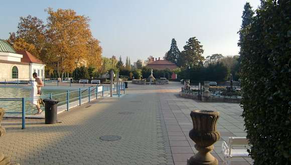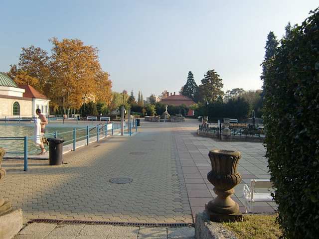 Dort wo die zwei Holztürme sind,dürfte wohl alter Eingang gewessen sei;neuer Eingang durch denn halben großen Park gehen, links sieht man schon die Badegäste, dann über eine kleine Brücke links, da ist man. Eintritt 5.30Euro.(ganzer Tag) pro Person. Kaution 1000Huf für das Umkleidekästchen, die man wieder zurück bekommt. Männer und Frauen getrennte Umkleideräüme. Frauen bekommen rote Bänder ,Männer blaue. Ein kleines Bufett wo man Getränke, Kaffee,Limo,Cola, Bier,Hot Dog,Schnitzel, Gulasch,Wurstsemmeln kaufen kann ist vorhanden. Aussenbecken 38 Grad, umso weiter man zu den Wasserhähnen kommt ,desto wärmer wird es. Außenbecken mit Masageliegen und Wasserfall der gelegendlich aufgedreht wird. 28-30 Grad. Badeschuhe und Bademantel mitnehmen. Versiedene Schimmbecken außen vorhanden siehe meine Fotos.