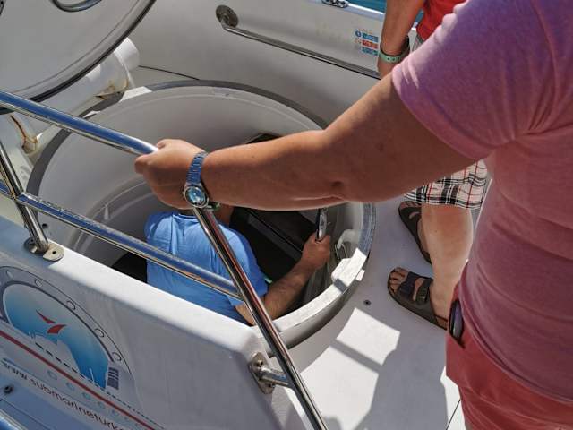Es gab kein gesunkenes Schiff zu sehen. Nur einen hampelnden Taucher unter Wasser. Dafür habe ich für 2 Personen 100 Euro bezahlt. Nepp, Bauernfängerei. Positiv war, dass das U-Boot wirklich getaucht. ist.