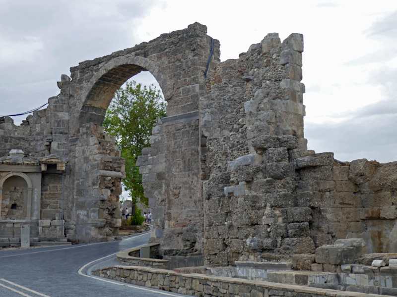Eigentlich ist das nicht der Vespasian-Torbogen , denn einen solchen gibt es nicht. Dieser Torbogen nennt sich INNERER TORBOGEN. Da ich noch nicht in den Inneren Torbogen kommen kann, bewerte ich diesen Bogen als Inneren Torbogen. Es ist somit für die Touristen besser diese Strasse zufuß zu erobern, als mit der Bimmelbahn zu fahren. Dieser Zug hält nicht hier, er hält erst wenn er am Museum oder am Eingang des Theaters ist. Dieser Innere Torbogen war und ist ein Teil der Stadtmauer, die auch noch an anderen Stellen zu sehen ist. Die Kollonadenstraße oder Fahrstraße nennt sich auf türkisch "Liman Caddesi".