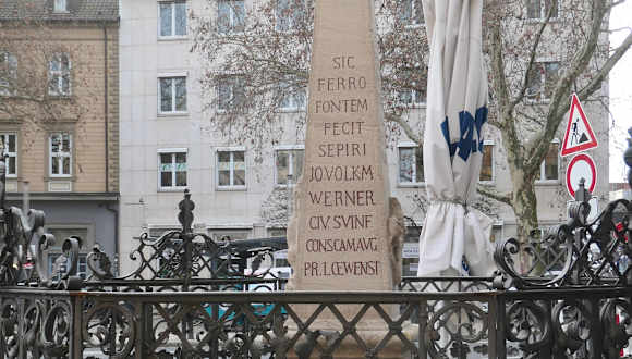 Am Albrecht-Dürer-Platz in Schweinfurt befindet sich an der Ecke Hohe Brückenstraße / Spitalstraße ein Brunnen mit einem Schmiedegitter, das sich auf dem achteckigen Brunnenbecken als Umrandung befindet). Aus dem Brunnenbecken erhebt sich ein kleiner, beschrifteter Steinobelisk, an dessen vier Seiten jeweils ein Rohr als Wasserauslass ragt. Es ist ein durchaus netter Brunnen und ein beliebtes Fotomotiv. Natürlich war jetzt im Januar das Wasser aus Sicherheitsgründen abgestellt.