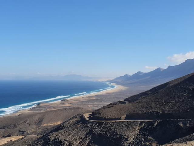 Die Tour beginnt in Morro Jable. Nach einigen Kilometern sieht man auf der rechten Seite einen Friedhof, bei dem dann auch die die asphaltierte Strasse endet und in eine Schotterpiste übergeht. Hier sollte man nicht mehr mit einem normalen PKW, sondern mit einem Geländewagen weiterfahren. Nach weiteren Kilometern kommt man an einer ehemaligen Plantage vorbei und dann zu einer Gabelung. Links geht es weiter zum kleinen Fischerdorf Puerto de la Cruz (El Puertito) und nach Punta de Jandia und rechts nach Cofete. Der Ausblick von der Strecke auf den Atlantik ist wunderschön. Über einen Pass, von dem aus man einen tollen Blick auf beide Seiten hat, geht es auf die nördliche Seite der Halbinsel Jandia durch Cofete zum Strand von Cofete. Hier hat man die Möglichkeit den Wellen zuzusehen und am Strand etwas spazieren zu gehen. Weiter geht es dann zur „Villa Winter“. In einigen Räumen der Villa lebt ein älteres Geschwisterpaar und für ein kleines Handgeld darf man die Villa auch betreten. Miguel zeigt seinen Gästen, was man von der Villa gesehen haben sollte und erklärt dabei viel. Nach dem Besuch der Villa geht es zurück über den Pass nach El Puertito zum Mittagessen. In dem kleinen Restaurant „El Caleton“ gibt es fangfrischen, sehr leckeren Fisch vom Grill. Nach dem Mittagessen kann man sich dann im Untergeschoss des Faro Punta de Jandia eine Ausstellung über die Flora und Fauna Fuerteventura ansehen oder man geniest den Blich nach Morro Jable, bei guter Sicht auch nach Gran Canaria und bei sehr guter Sicht sogar bis zum Teide auf Teneriffa. Kurz vor dem Faro Punta de Jandia befindet sich die wirklich schmalste Stelle von Fuerteventura – nur 200m sind es von Küste zu Küste und man kann beide Küsten gleichzeitig sehen ohne den Kopf drehen zu müssen. Weiter geht die Fahrt ein Stück zurück bis El Puertito. Hier zweigt eine weitere kleine Holperstrecke, mit tiefen Schlaglöchern, rechts nach Punta Pesebre ab. Zur linken Seite befindet sich der goldgelbe, feine und steinige Strand Playas de Ojos. Auf der rechten Seite erstreckt sich, kaum sichtbar, ein ehemaliges 700m langes Flugfeld. Es wird in Verbindung mit, dem Ingenieur und ehemaligen Gutsherrn, Gustav gebracht. Nach einem weiteren Kilometer kommt man zur Punta Pesebre. Dort ist ein kleines Häuschen zu sehen. Miguel sagte uns es sei das letzte Toilettenhäuschen vor Island. Folgt man dem Längengrad auf dem sich Punta Pesebre befindet ist da nächste Festland das man erreicht Island. Von hier aus hat man einen faszinierenden Weitblick auf den gesamten südlichen Küstenverlauf der Westküste von Fuerteventuras Man kann den Playa de Cofete und die Villa Winter sehen. Der Atlantik ist sehr rau und die Brandungswellen sind hoch. Leider endet diese wundervolle Tour hier und es geht zurück nach Morro Jable. Wir sind froh diese Tour mitgemacht zuhaben und würden es auch wieder tun. Die Tour ist jeden Cent wert.