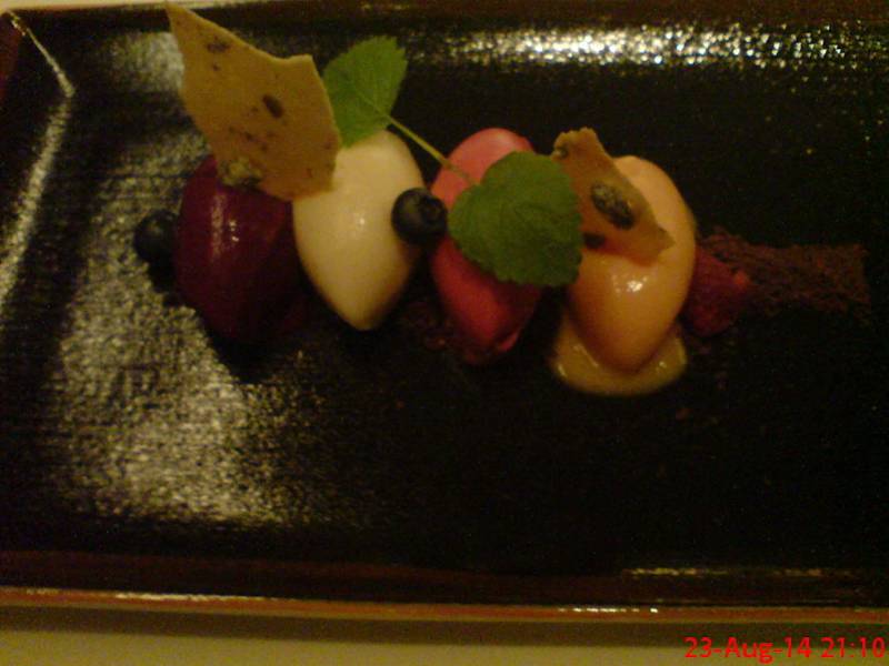 Wir gönnten uns einen Abend zu zweit im Vox. Die Reservierung klappte im Vorfeld gut und wurde vom Grand Hyatt zurückbestätigt. Wir aßen diesmal à la carte: Als Vorspeise wählten wir Sushi (den großen Vox Teller und eine California Rolle) und als Hauptgang das Milchkalb-Gericht aus der Menü-Karte. Das Sushi war sehr gut zubereitet. Ganz lecker war das Zweierlei vom Milchkalb, das Fleisch auf den Punkt gegart. Zum Dessert aßen wir den Schokoteller Vox und Viererlei Sorbet, sehr gut, sehr lecker. Wir wurden vom Service prima, locker und kompetent beraten. Das Menü beginnt bei 46 Euro für drei Gänge, die Sushi-Gerichte liegen in der Spitze bei 35€.