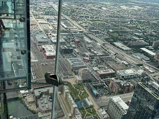 Zum ersten Mal besuchten wir in Chicago den Willis Tower. Er liegt Downtown und kann gut erreicht werden mit dem Hop-On-Bus. Wir hatten vorab Reisepässe besorgt und mussten nur noch Termine machen. Da das Wetter sehr gut war, probierten wir - ohne Probleme!!! - einen spontanen Besuch. Die Terminbuchung verhindert lange Schlangen - schön, dass so etwas inzwischen möglich ist! Und wie es der Zufall will, von unserem Hotelzimmer könnten wir den Willis Tower sehen 😊