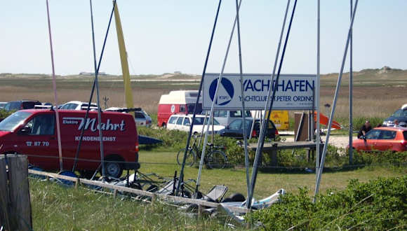 An der Strandüberfahrt zum Pfahlbau-Restaurant Strandbar 54° Nord liegt ein kleines Fleckchen Erde, auf dem ein Schild mit der Aufschrift „Yachthafen“ steht. Wer den Namen „Yachthafen“ für dieses Plätzchen erdacht hat, muß eine lustige Person sein. Es ist kein Hafen im eigentlichen Sinne. Es ist ein „Trockenliegeplatz“ für Boote und für Strandsegler, fernab des Wassers. Aber – es soll wirklich einen kleinen Hafen geben. Dieser soll am Tümlauer Koog liegen, mit Ankerplätzen im Ordinger Priel und vom „SSPO - Sportbootclub St.Peter-Ording e.V.“ betrieben werden.
