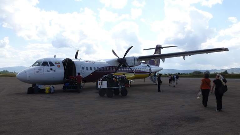 Am Flughafen in Yangon wird noch bodenständig gearbeitet. Man sollte ca. eine Stunde vor Abflug am Flughafen sein. Der Gepäck-Check-Inn funktioniert wie an einer Garderobe. Ein Zettelchen wird mit einem Gummiband am Koffer befestigt und wir erhalten den Abriss. Computer gibt es nicht. Dann werden die Koffer einzeln auf einen Koffertrolley umgeladen. Ein junger Mann schiebt ihn auf dem Trolleywagen in die Wartehalle, um die Gepäckstücke dann auch einzeln zum Flugzeug zu bringen Ein ähnliches Verfahren haben wir bei all unseren weiteren Flügen innerhalb Myanmars erlebt. Die Flüge hatten wir von Deutschland aus bei einer deutschen Reiseagentur gebucht. Das ist auch in Myanmar über Hotels, Guesthouses, direkt bei der Fluggesellschaft oder über Reiseagenturen möglich. In der Abflughalle ist es voll, laut, chaotisch, quirlig. Elektronische Anzeigetafeln sucht man vergebens. Ist ein Flug bereit zum Boarding, hält ein Flughafenmitarbeiter ein Schild mit der Flugnummer hoch und schreit in den Raum, der Flug sei so weit. Da sollte man während dessen nicht z.B. auf der Toilette sitzen und diesen einzigen, kostbaren Moment verpassen, denn sonst fliegt der Flieger ohne dich. Unser Flug (Air Mandalay) wird aufgerufen. Wir steigen in einen betagten Flughafenbus, der uns die 200m bis zum Flugzeug fährt. Auf uns wartet eine Propellermaschine, ausgelegt auf ca. 60 Passagiere. Der Flieger (Typ ATR 72) befindet sich in gutem Zustand, ist voll ausgebucht und startet 10 Minuten vor der offiziellen Abflugzeit. Uns wird ein Frühstück serviert: Croissants mit Hühnchen und Kaffee. Alle unsere Flüge verliefen ereignislos. Das Personal war professionell und freundlich. Flüge sollten in Myanmar immer ca. 24 Stunden vor Abflug rückbestätigt werden, da sich oft kurzfristig etwas ändern kann: In Heho wurde z.B. unser Vormittagsflug nach Yangon auf den Mittag verlegt. Der Flug von Nyaung U nach Mandalay wurde spontan morgens am Flughafen auf die Fluglinie "Air KBZ" umgebucht, weil die Maschine von Air Mandalay nicht flog. Das funktionierte unkompliziert und das Flugzeug von Air KBZ machte einen guten Eindruck. Bei der telefonischen Rückbestätigung der Flüge helfen Hotels / Guesthouses gerne.
