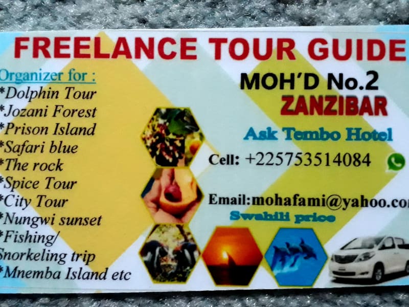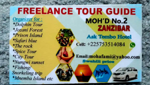 Rashid: phone: +255773339563 email: rashid@zanzitours.net Abdulla: Phone : +255773942244 Email: Dusity9@yahoo.com www.zanzibarbeachtours.com Sehr guter deutschsprachiger Tourguid, für alle Touren! Ihr könnt Ihn auch per WhatsApp unter obiger Nummer erreichen!