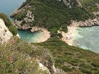 Es gibt mehrere Möglichkeiten diese Zwillingsbucht zu erreichen. Man kann sich am Strand von Agios Georgios Pagi ein Tretboot mieten und hinfahren. Oder im Norden der Bucht bei Spyros anfragen ob der einen mit einem Motorboot hinfährt und ggf. auch zu einer bestimmten Uhrzeit wieder abholt. Wir haben den Fußweg gewählt. Dazu muss man erst zur Taverne Dionysos im Nordwesten von Afionas am Dorfplatz. Von Dort erreicht man die Taverne nur zu Fuß. Geht man links an der Taverne vorbei, kann man über Steine (kein richtiger Weg) zu den beiden Buchten herabsteigen. Wir haben mit kleineren Fotopausen 20-25 Minuten gebraucht. Ich würde es nur empfehlen, falls man halbwegs fit ist und am besten auch nur mit festem Schuhweg. Ist man dann angekommen erwarten einen zwei wunderschöne Buchten mit türkisblauem Wasser. Viel dürfte dort nie los sein, man ist also relativ ungestört und kann erstmal ein erfrischendes Bad nehmen (steinig im Wasser und teilweise am Strand). Vor Ort wird es auch als Afionas Beach bezeichnet. Nach dem Rückweg kann man wunderbar eine Mahlzeit in der Taverne Dionysos einnehmen, die einen tollen Blick auf die Bucht von Agios Georgios Pagi bietet.