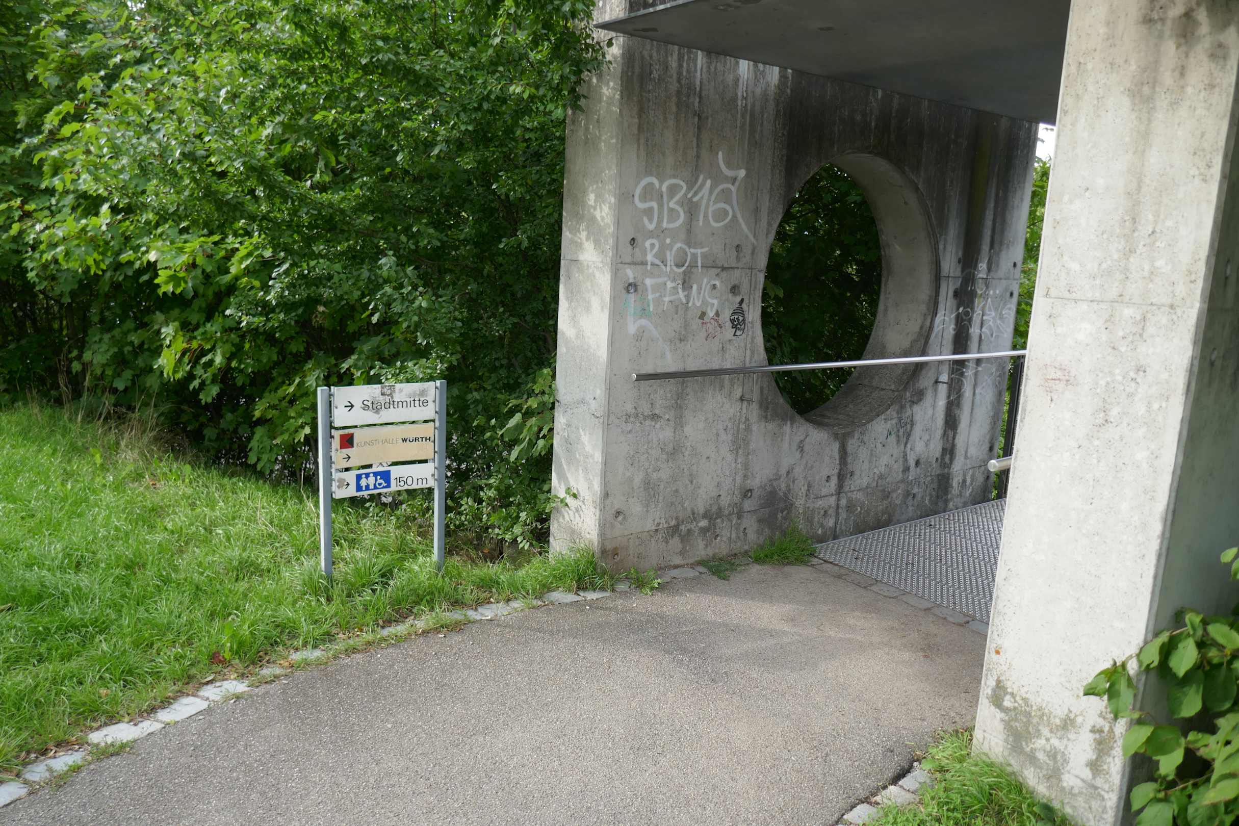 Hinweisschild, Weg zum Lift über kleine Brücke