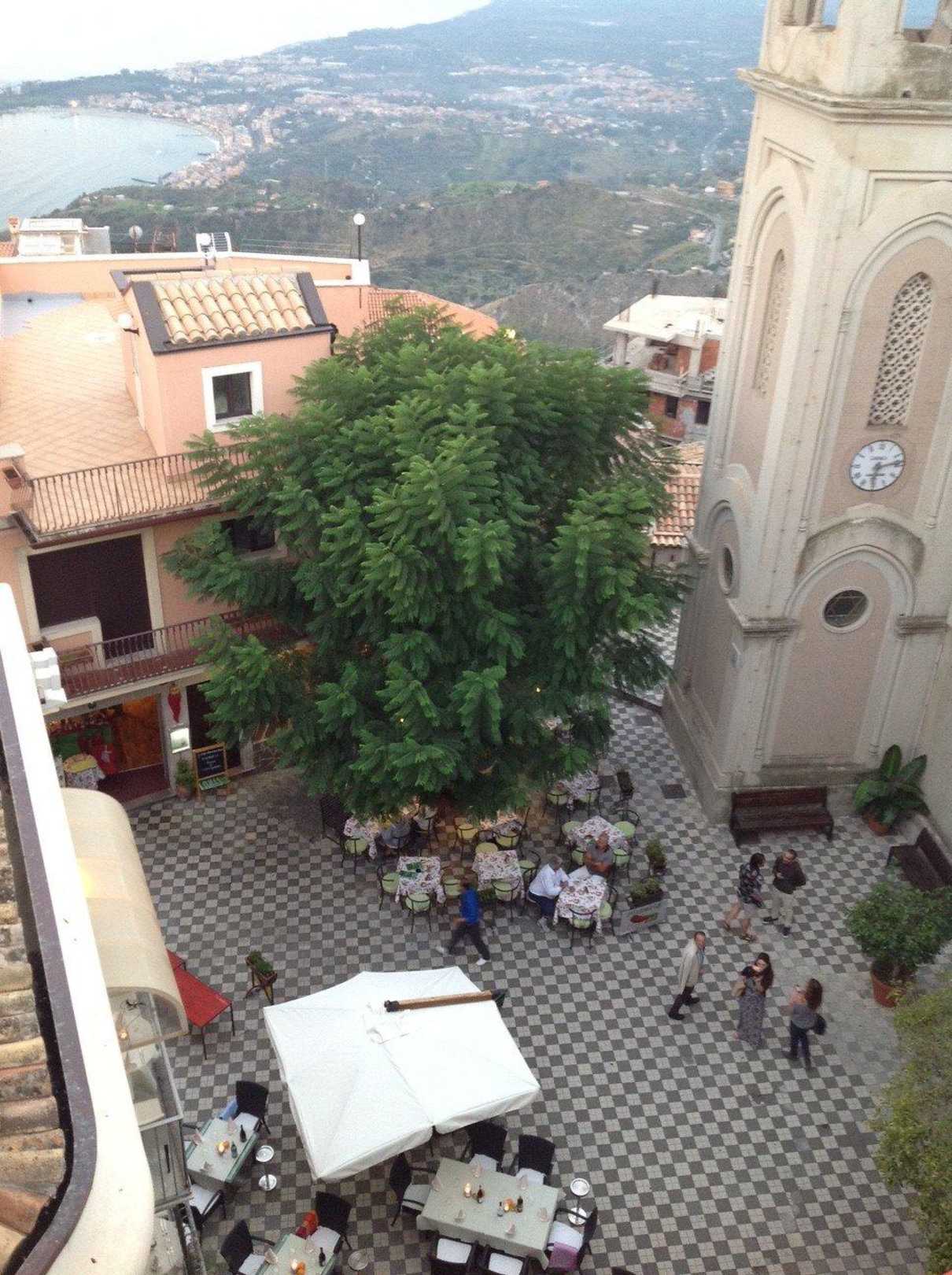 Blick von der Terrasse auf den Platz bei der Kirche
