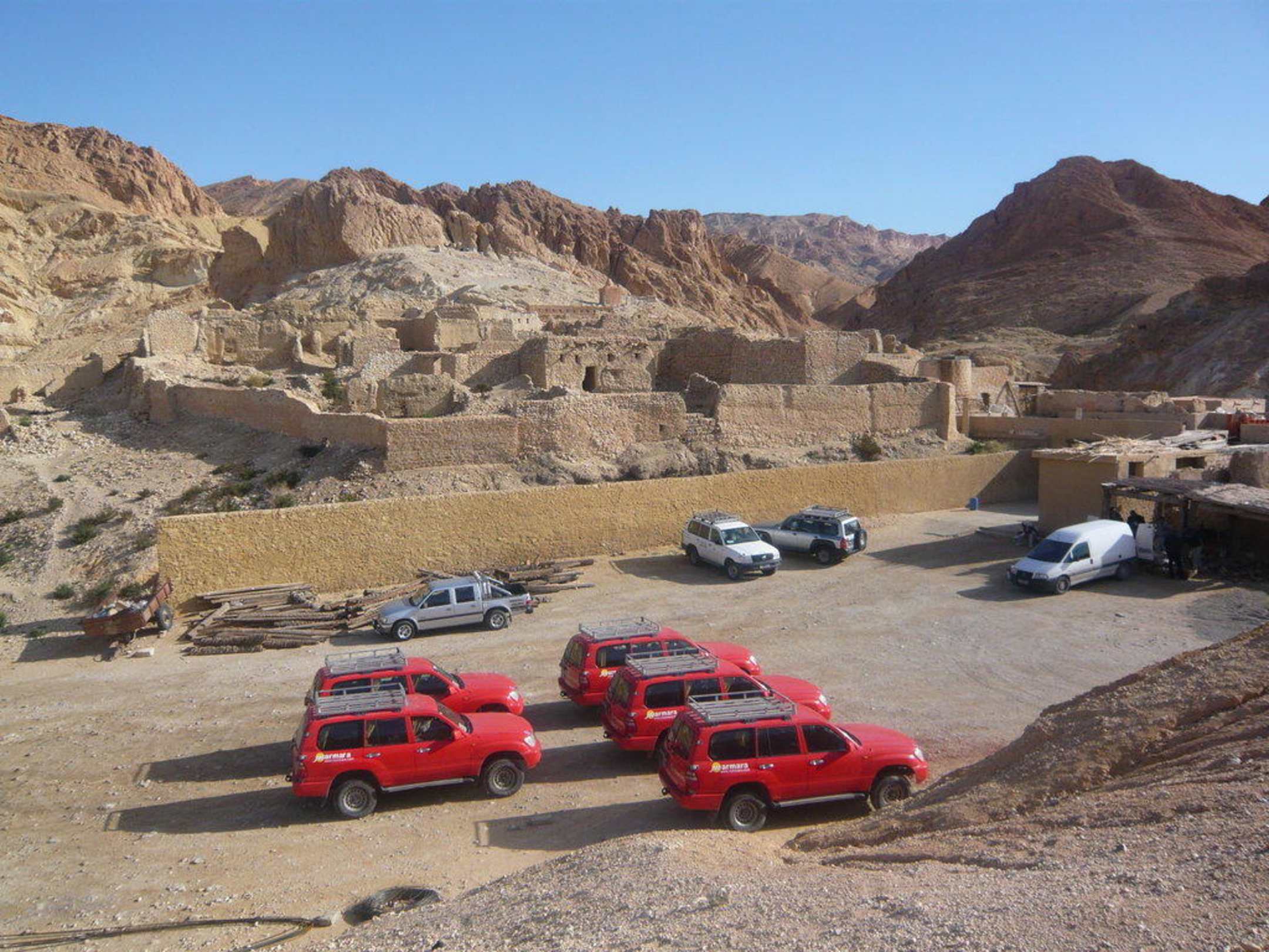 Parkplatz der Jeeps und die alte Oase