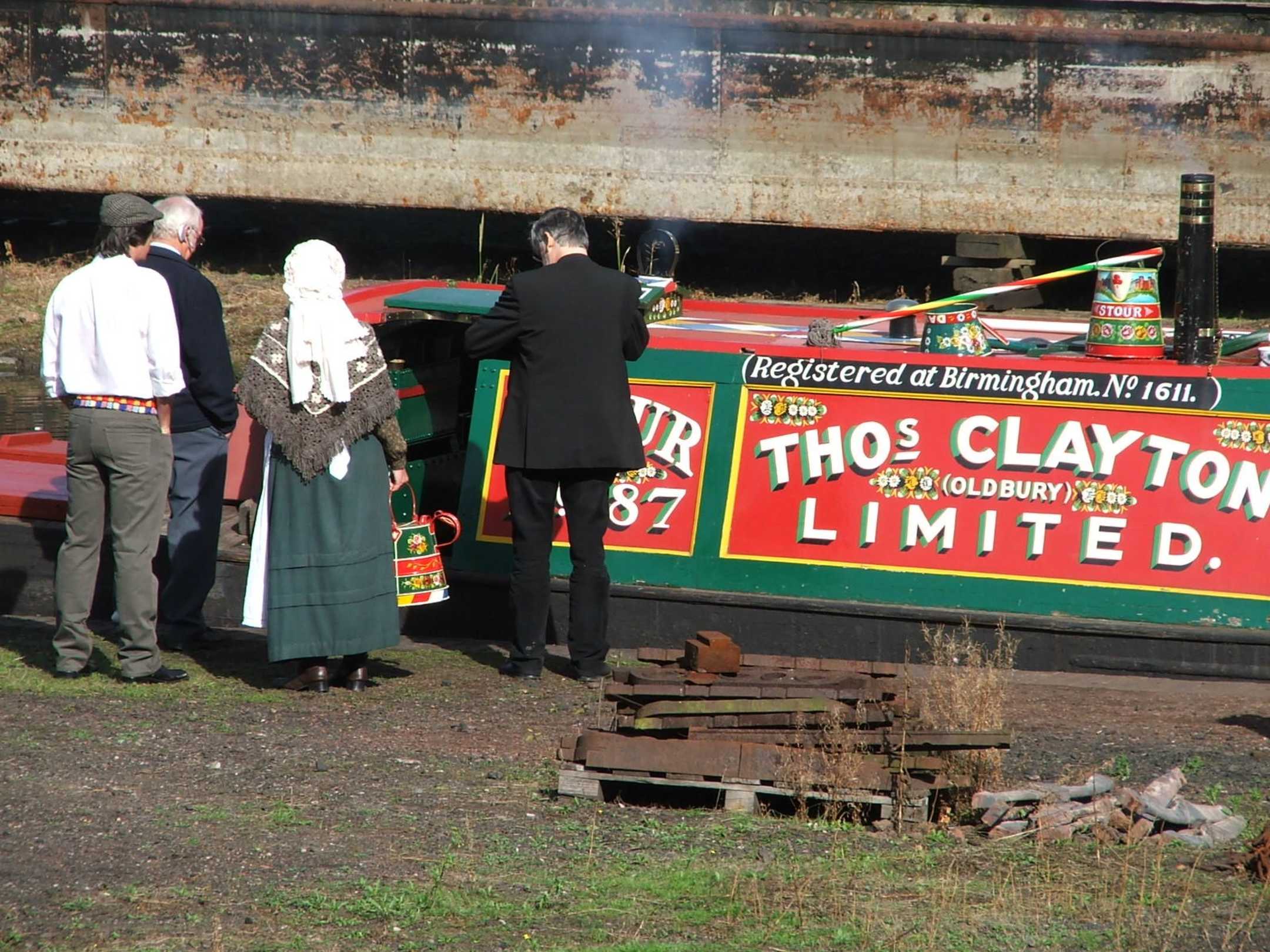 Decorated barge and people in traditional costume