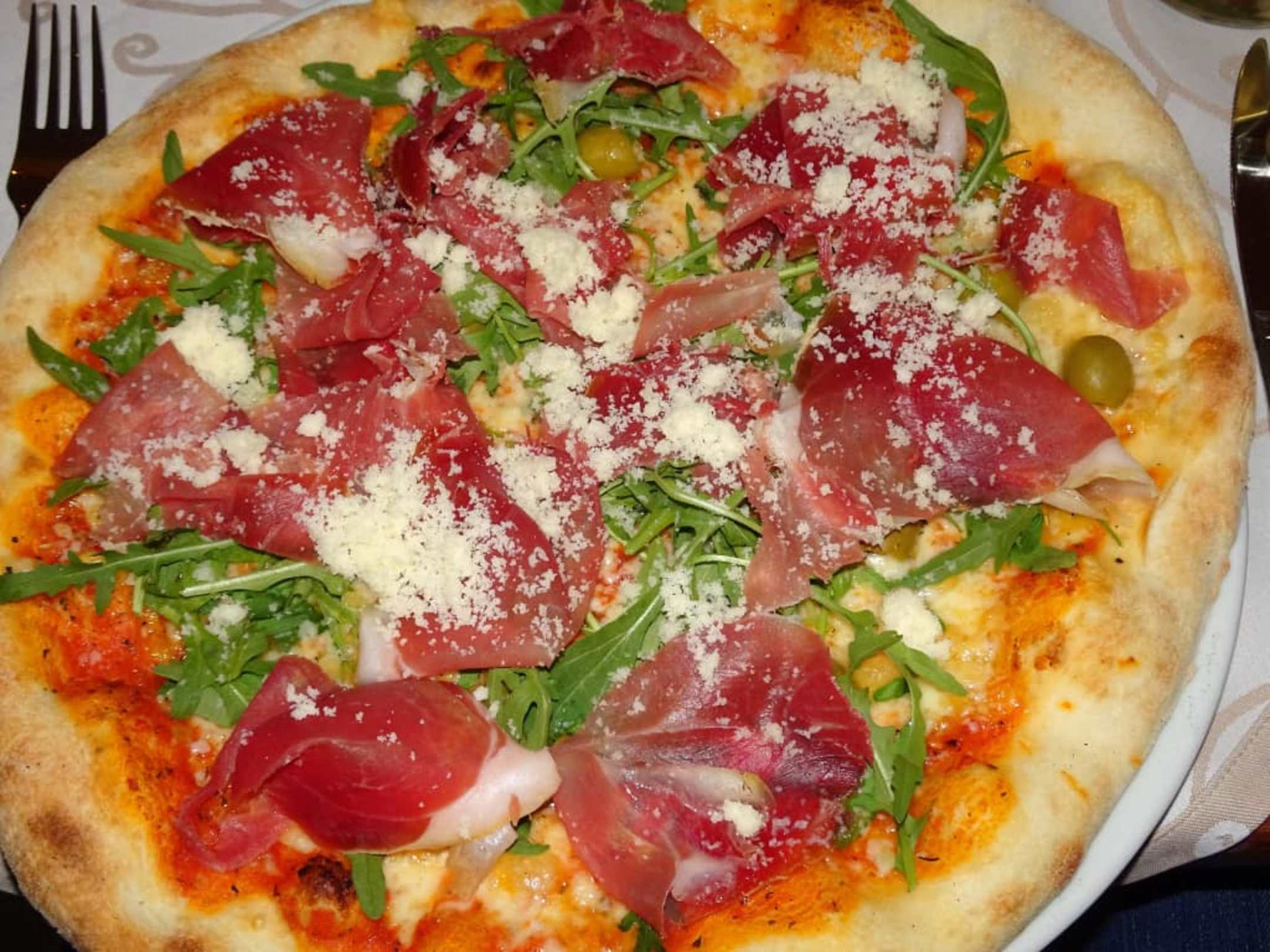 Die Pizza Prosciutto im Restaurant Costa