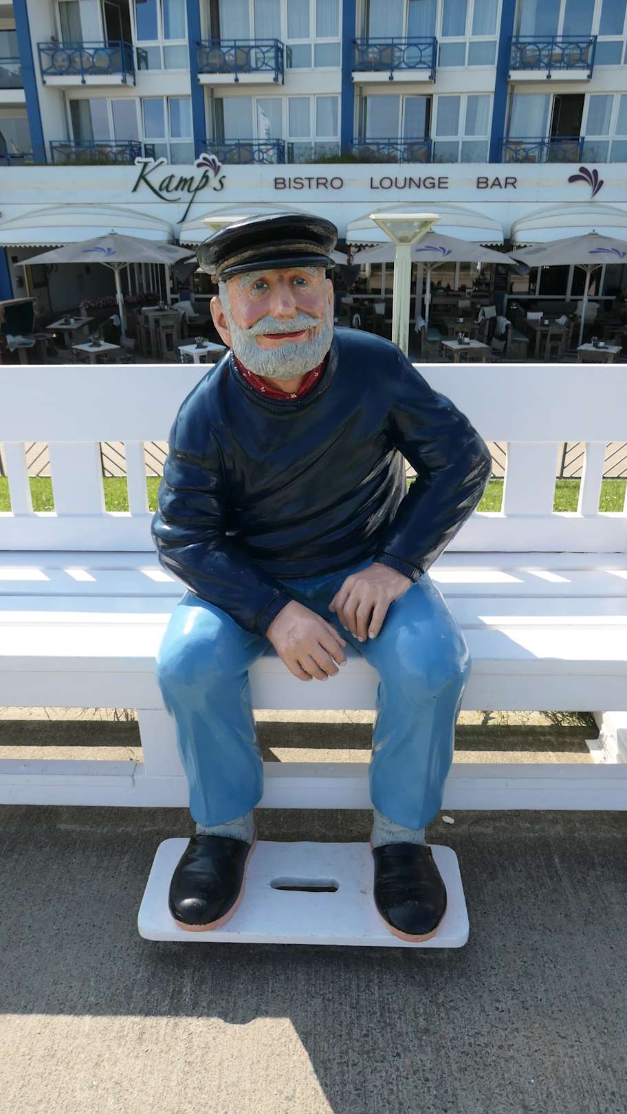 Kuddel auf der Bank auf dem Duhner Deich