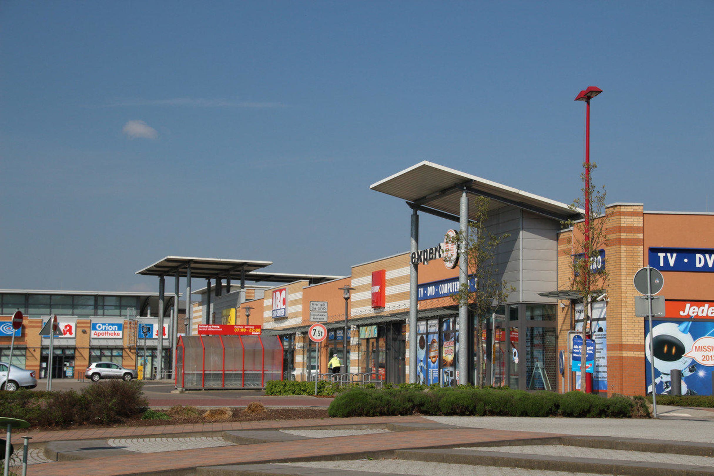 Blick vom Parkplatz auf das Einkaufszentrum