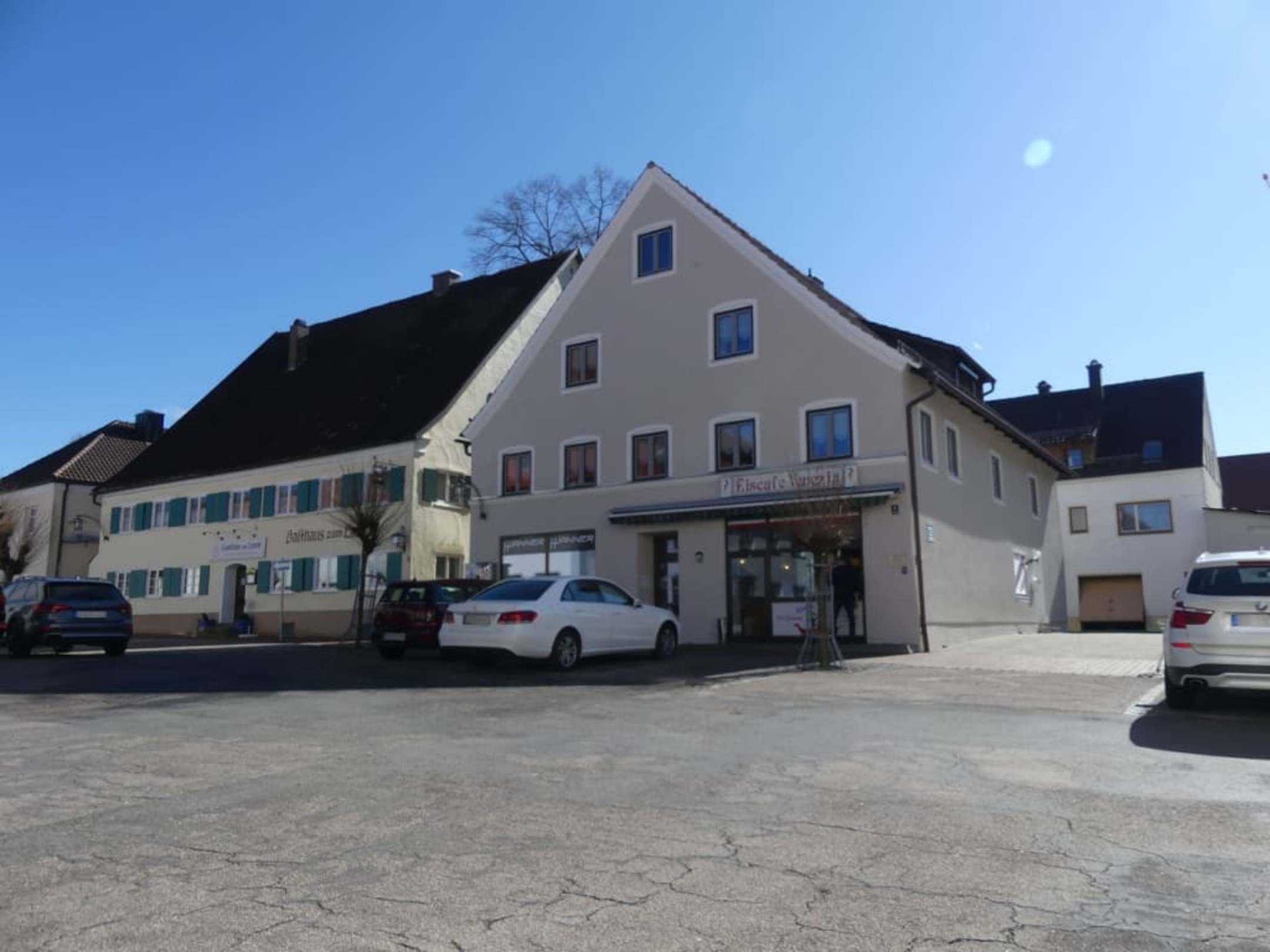 Außenansicht und Parkplatz vor der Eisdiele