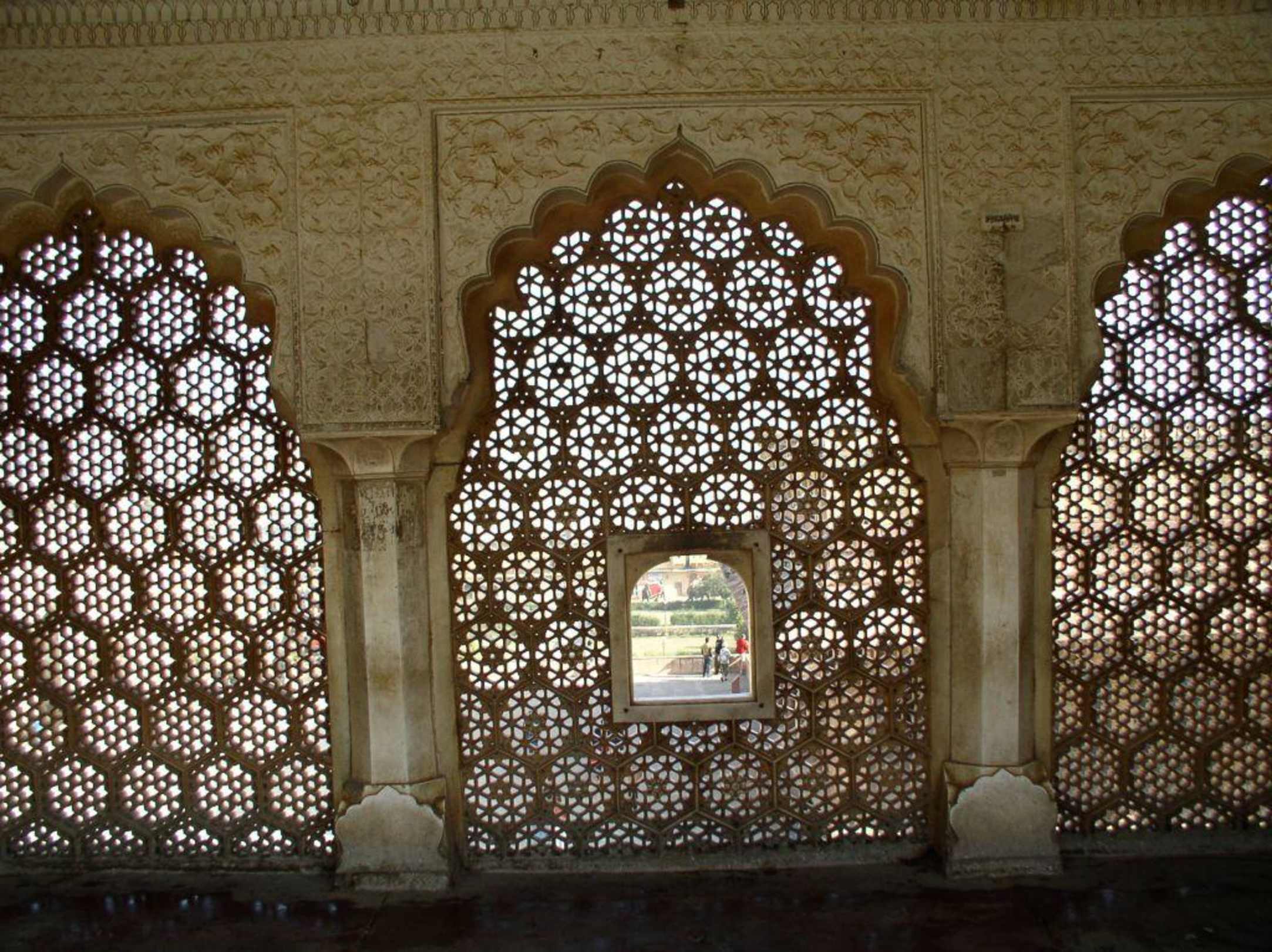 Blick durch ein Sandsteinfenster auf den Hof des Fort Amber