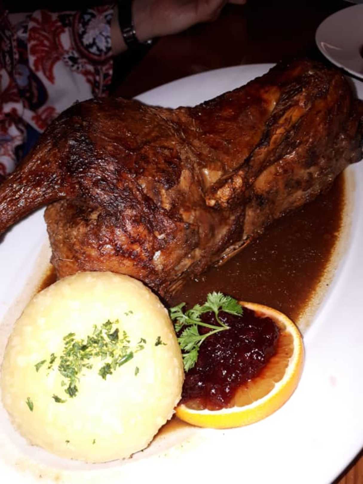 1/2 gefüllte Bauernente mit Blaukraut u. Kart.knöd