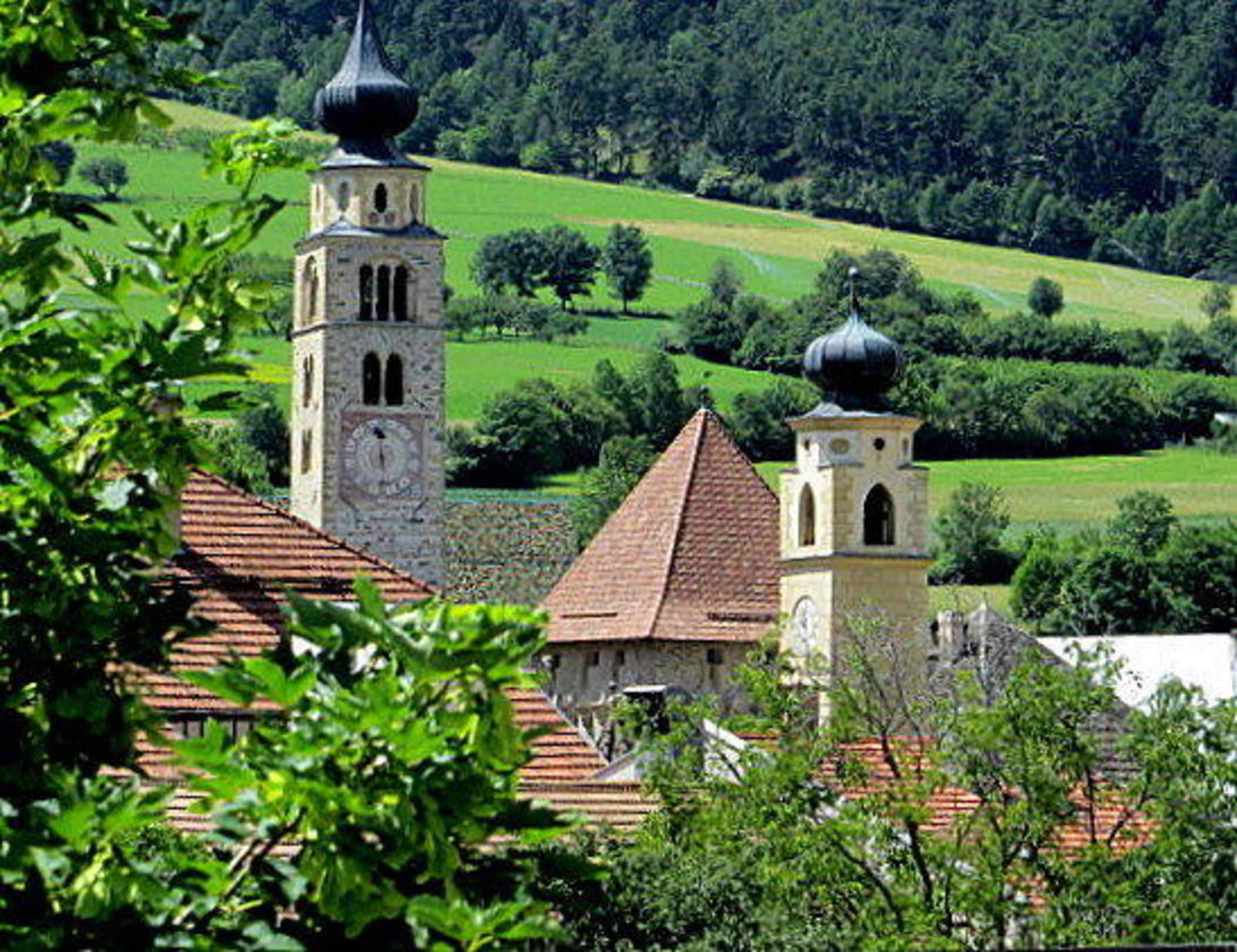 Blick auf die 2 Kirchen und einen Wehrturm