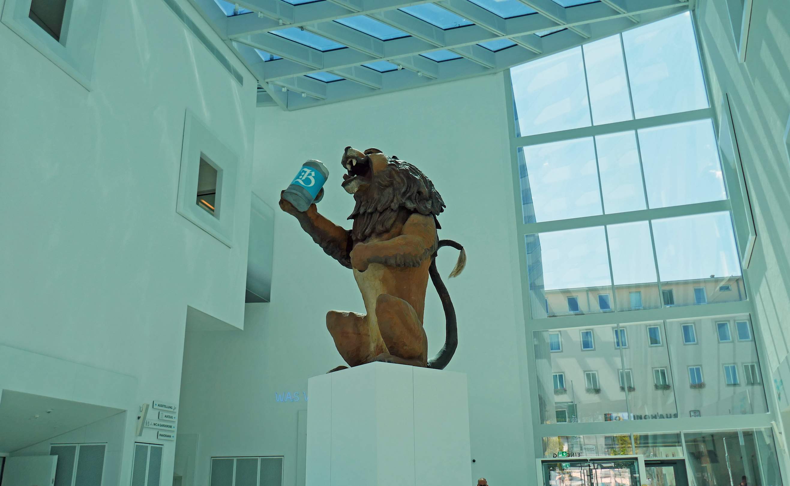 Im Vorraum des Museums trinkt der Löwe Bier