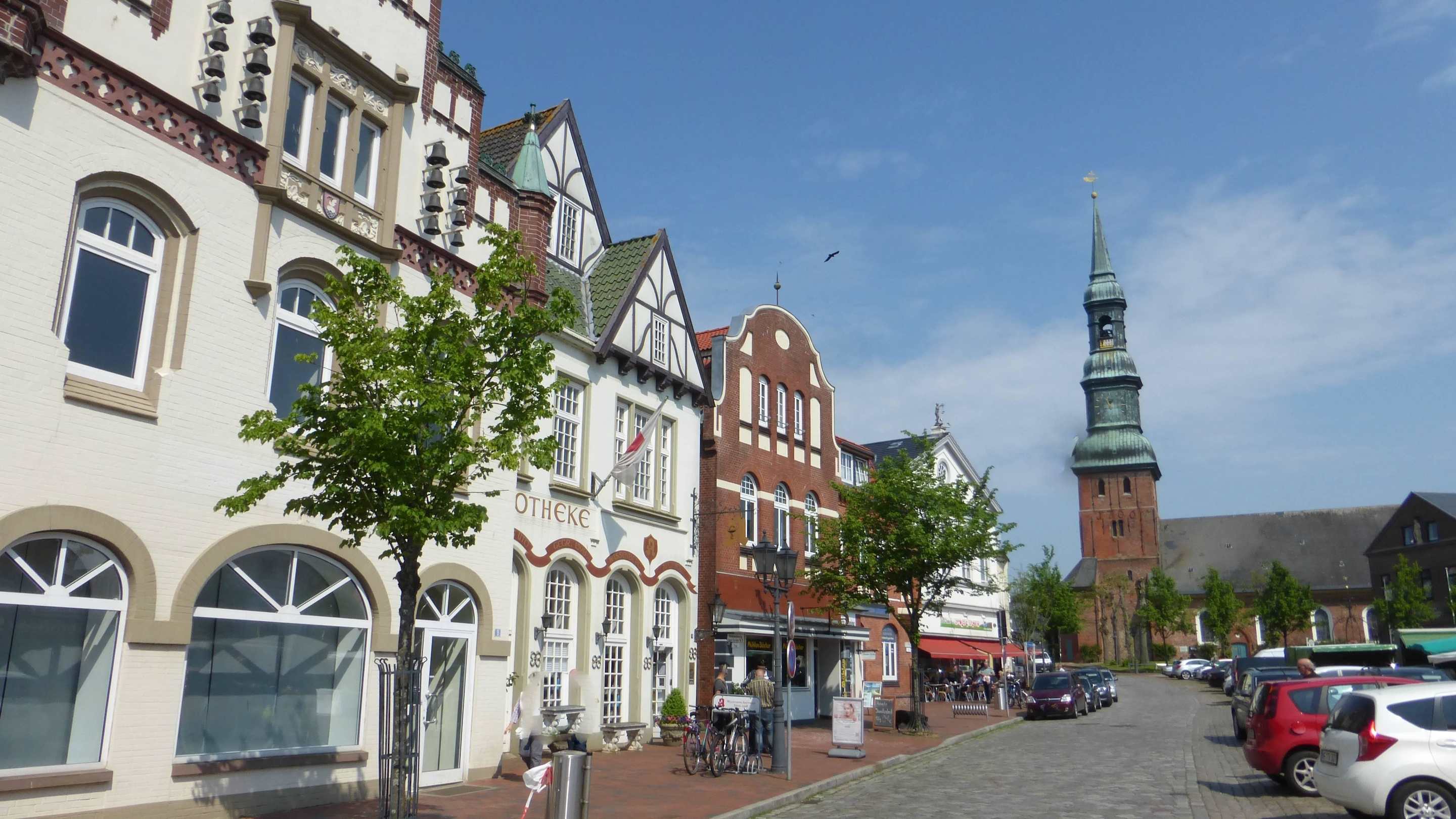 Marktplatz Tönning: Häuserfront und St. Laurentius