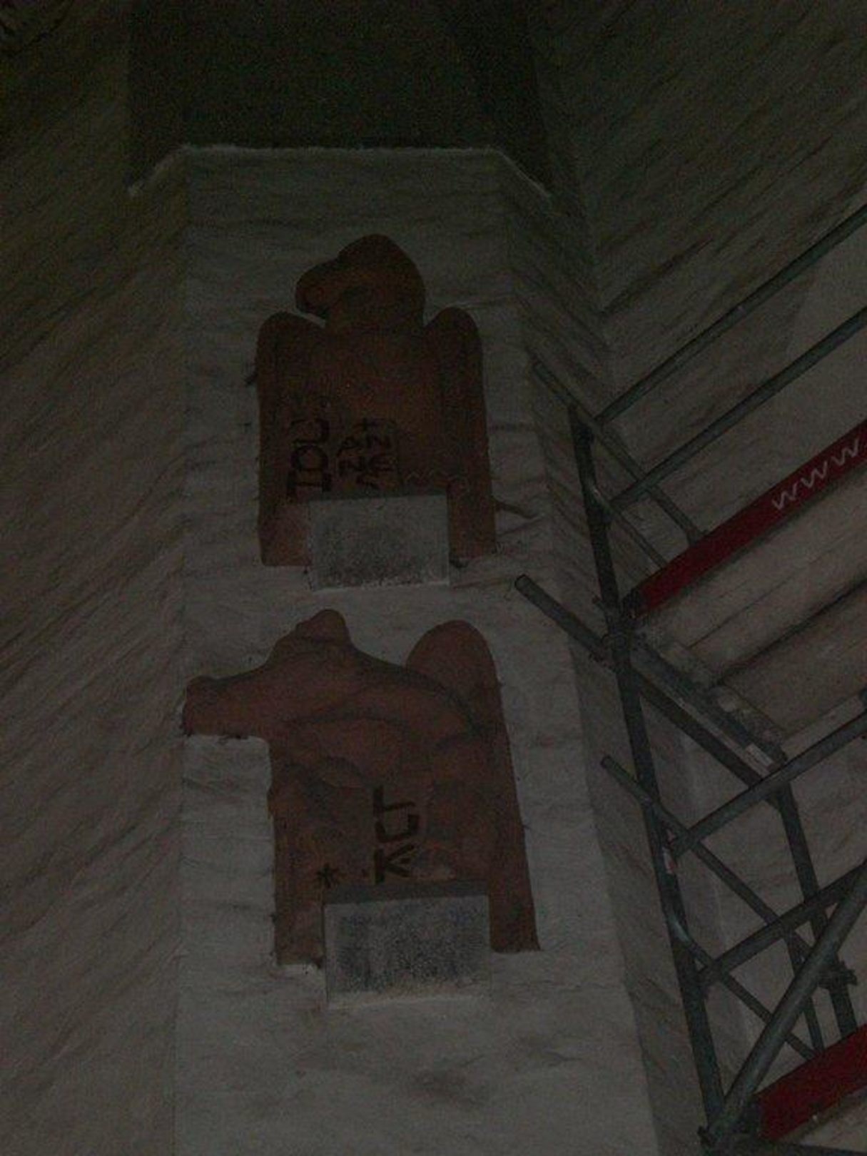 Holzfiguren in der Wand der Kirche.