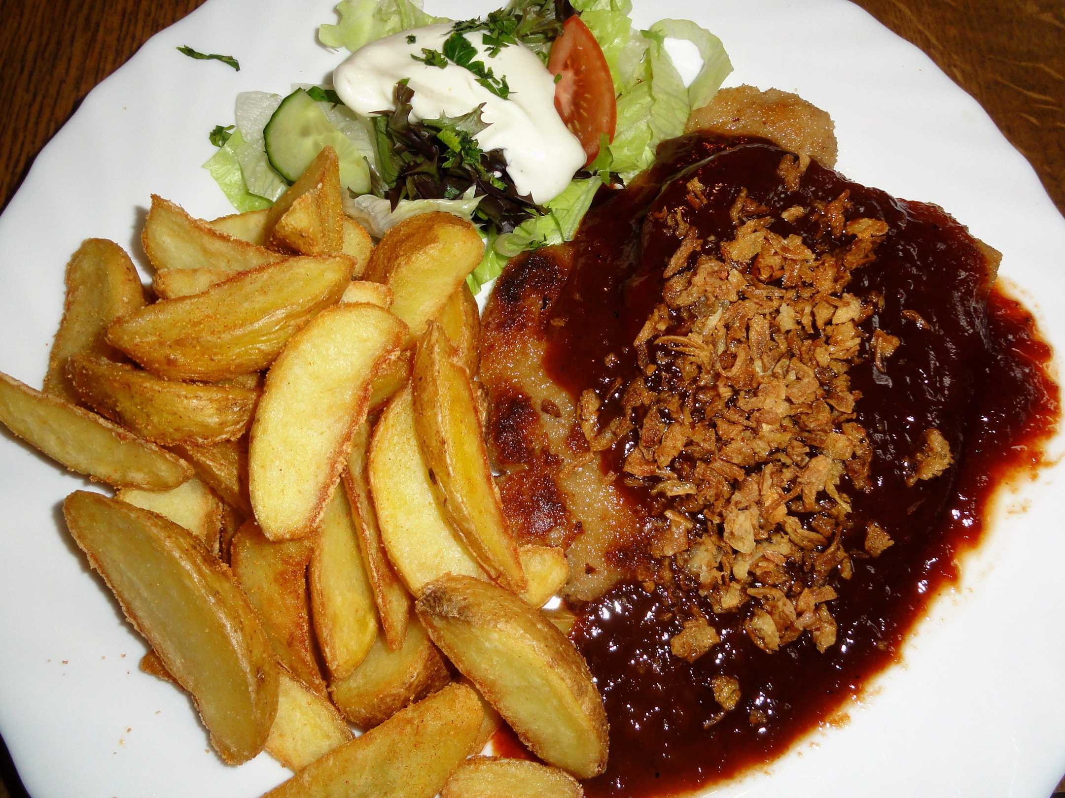 Westernschnitzel mit BBQ-Sauce und Röstzwiebeln