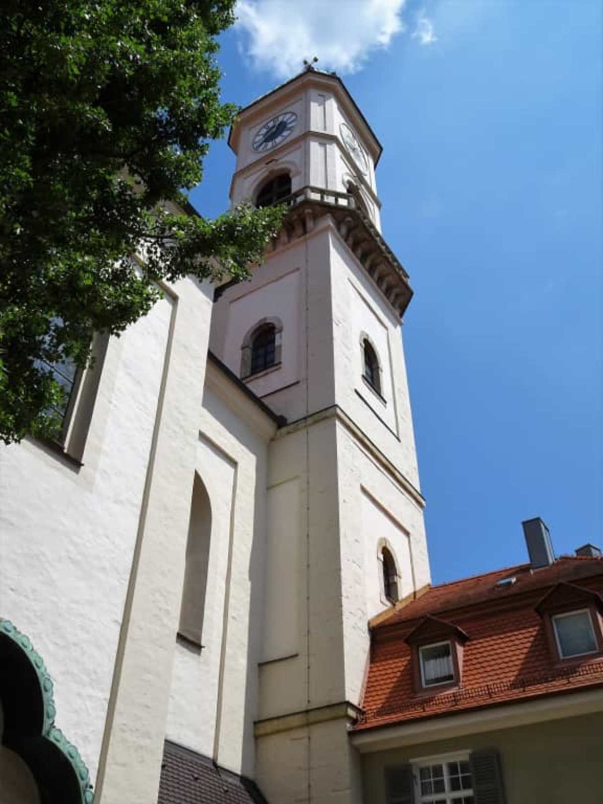 Blick auf den Glockenturm der Kirche St. Mang