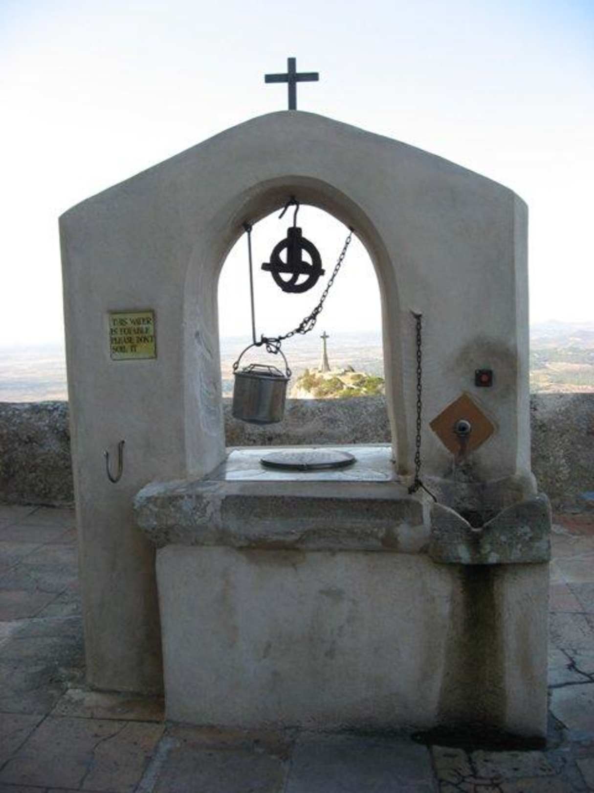 Durch den Klosterbrunnen blickt man zum Kreuz