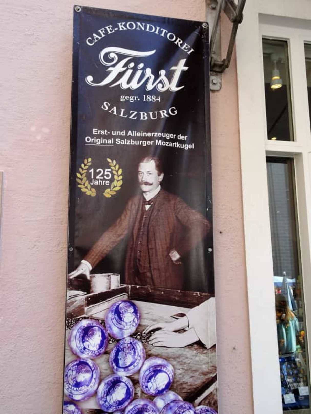 Werbebanner am Stammhaus der Konditorei