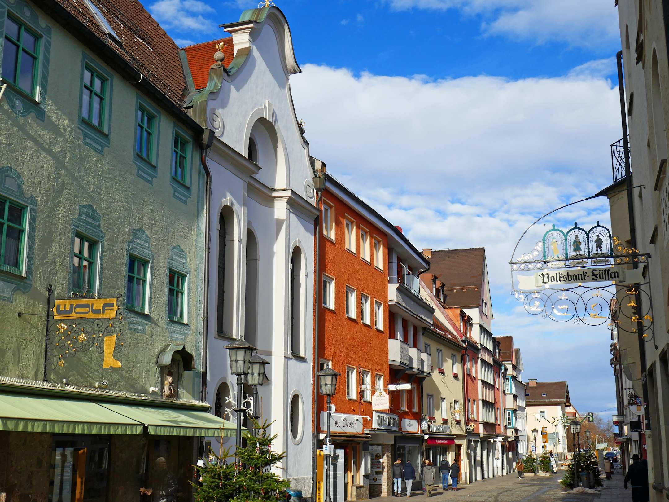 Die Kirche steht links zwischen den Häusern, weiss