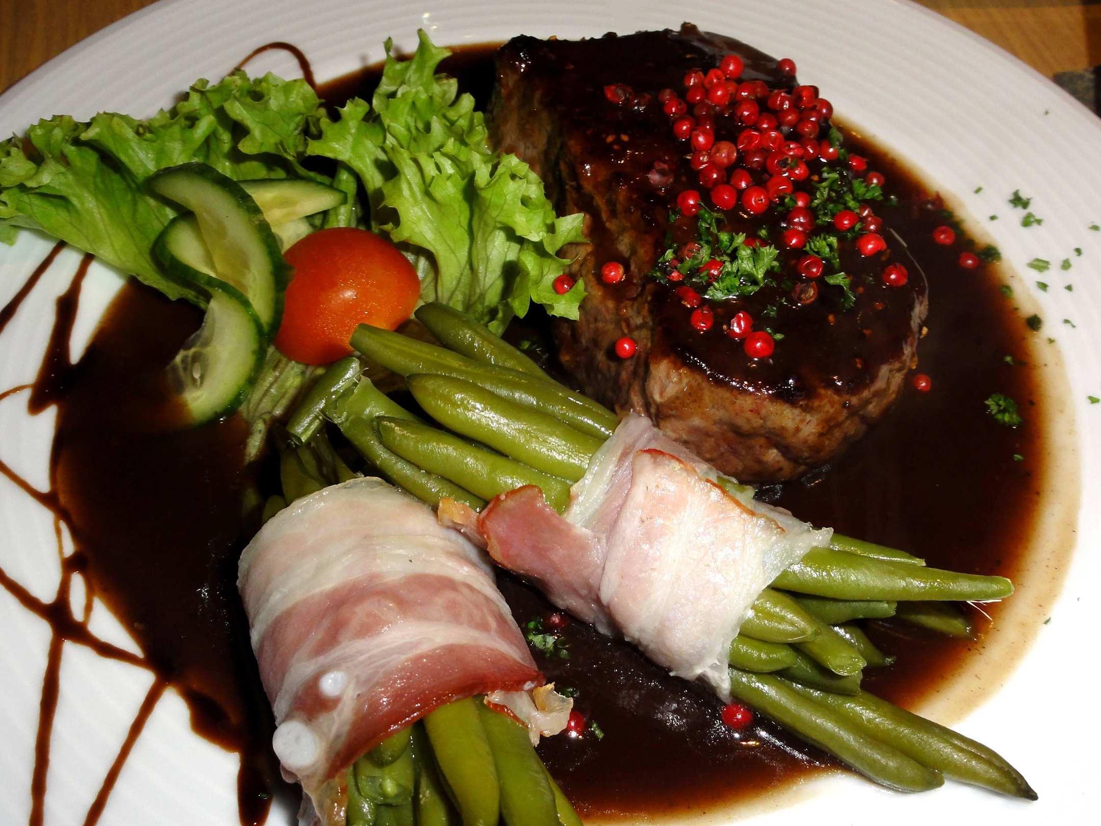 Pfeffersteak mit Speckbohnen