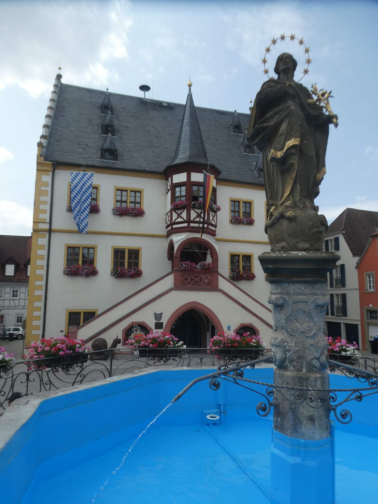 Volkach: Marienbrunnen und Rathaus am Marktplatz