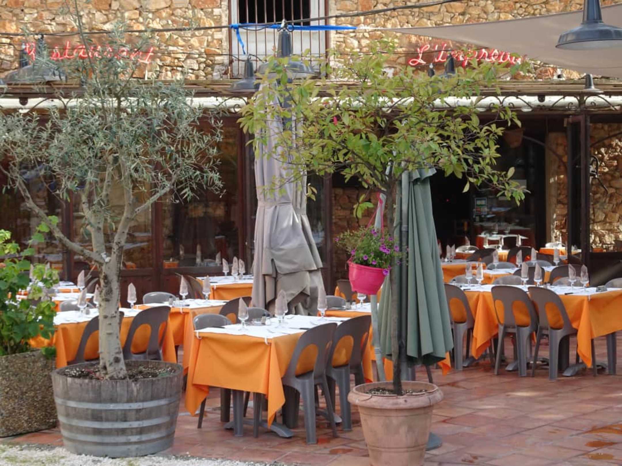 Blick auf die Tische im Innenhof der Pizzeria