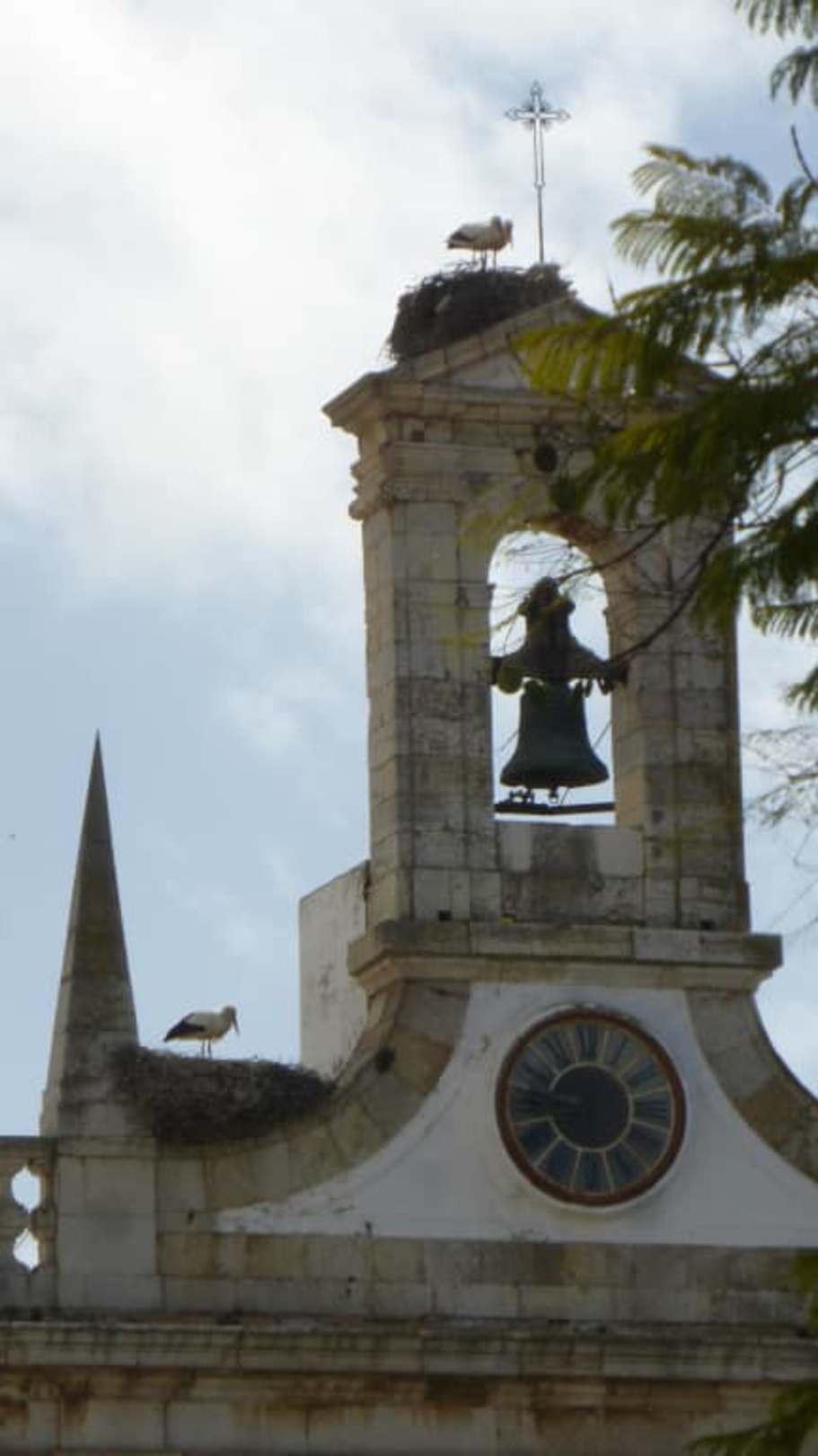 Brütende Störche auf dem Arco da Vila