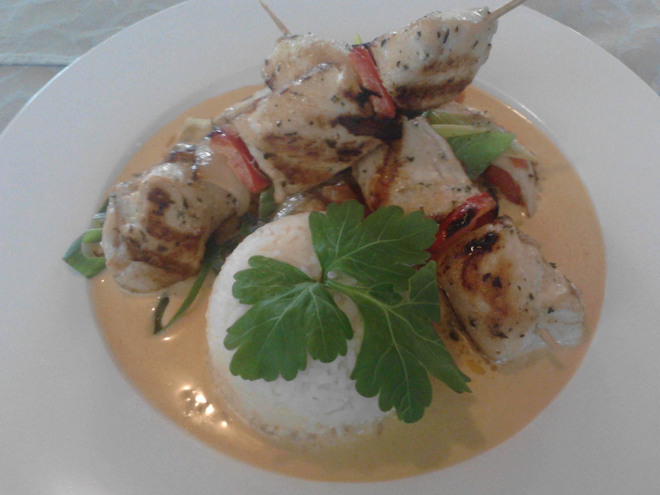 Hähnchenspiesse Thai-Curry Tomaten-Lauch Gemüse