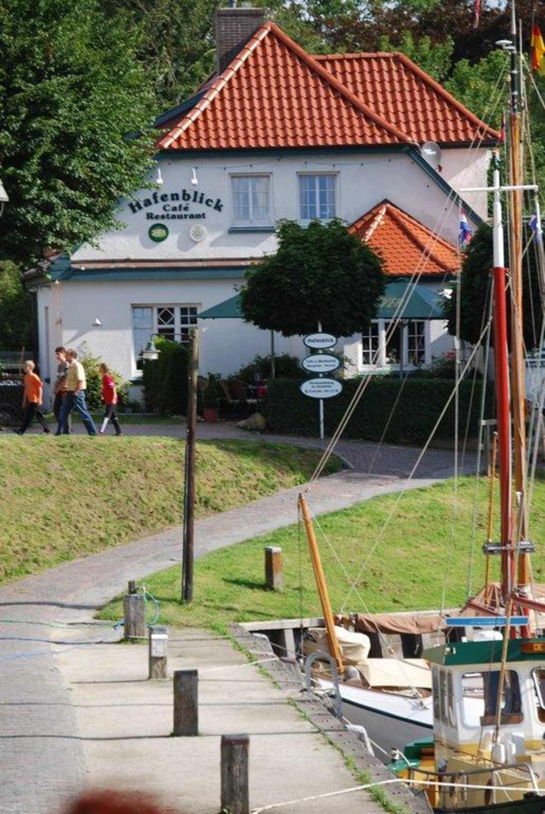Das Restaurant Hafenblick im Hintergrund