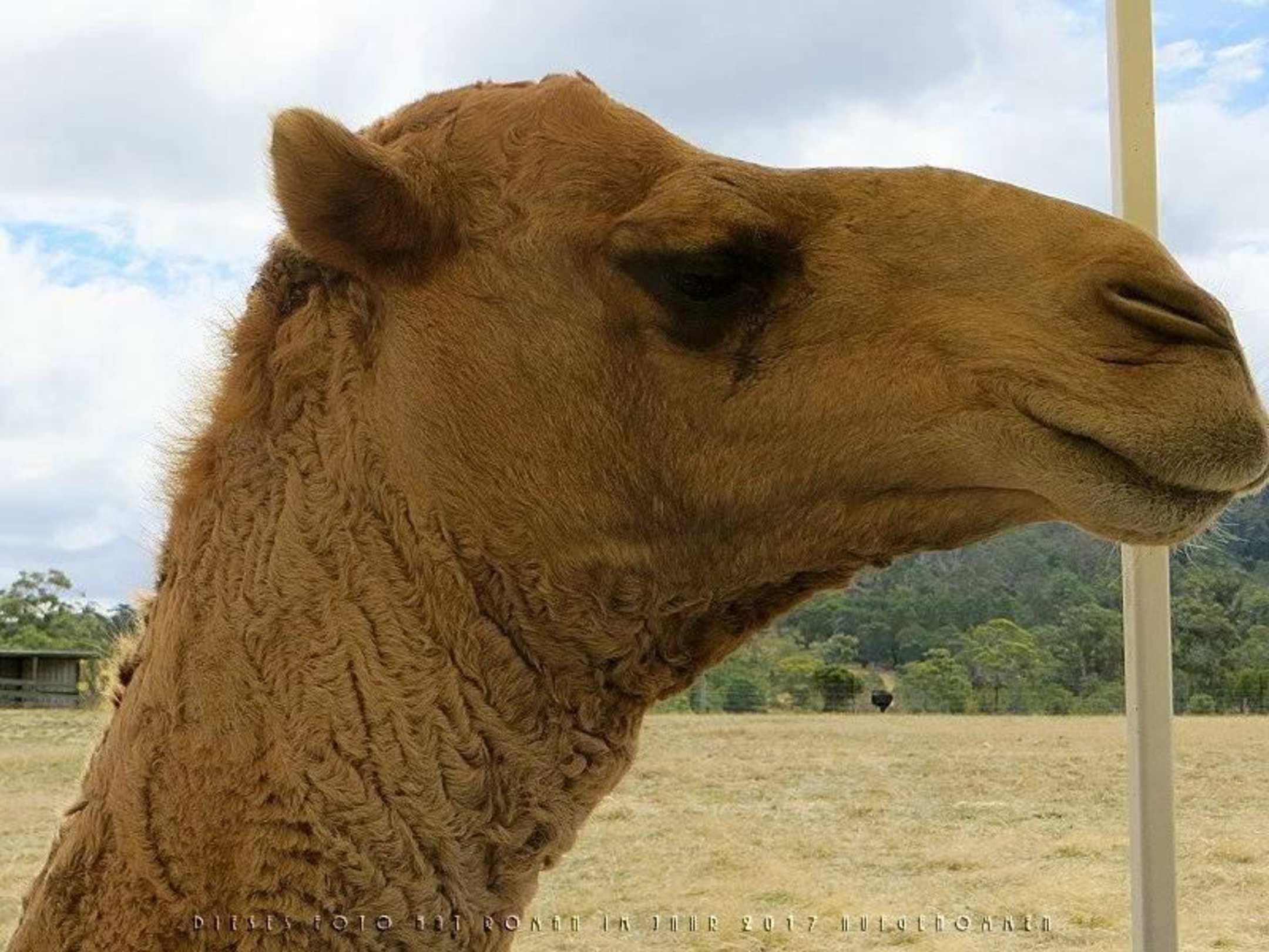 Dromedar bei der Fütterung im Planwagen