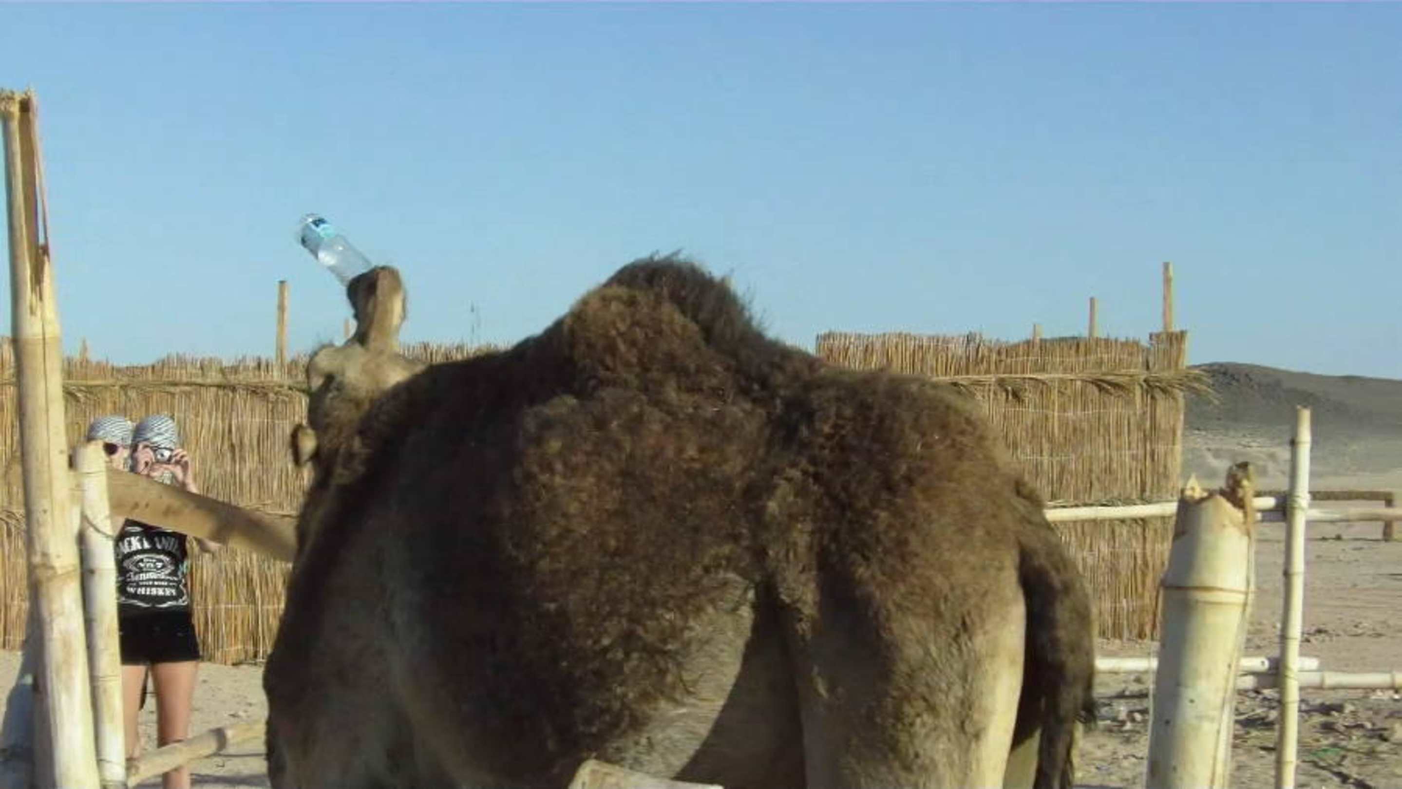 Im Beduinen Dorf, Kamel säuft aus Flasche