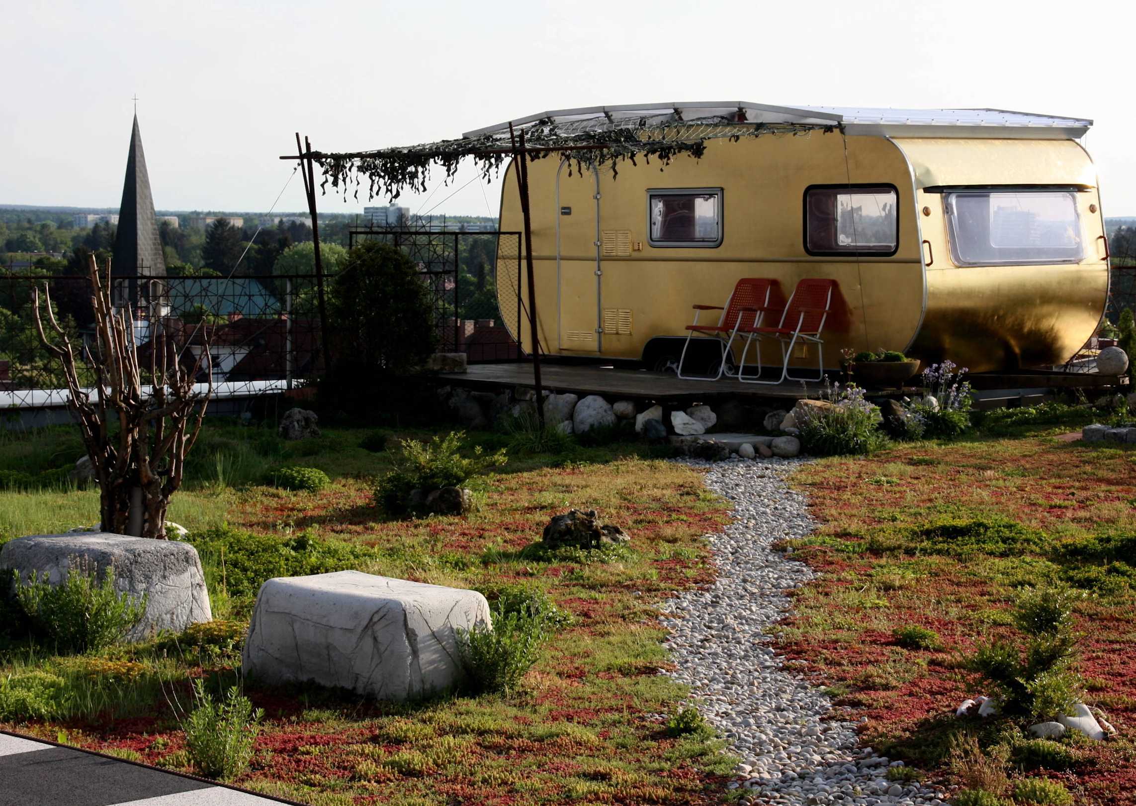 Teilweise bewohnter vergoldeter Wohnwagen
