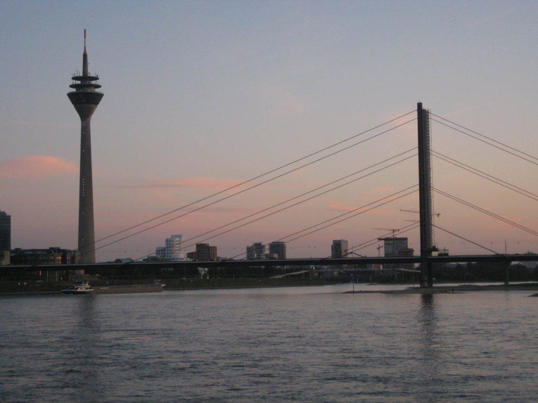 Blick auf den Rhein mit Rheinturm im Hintergrund
