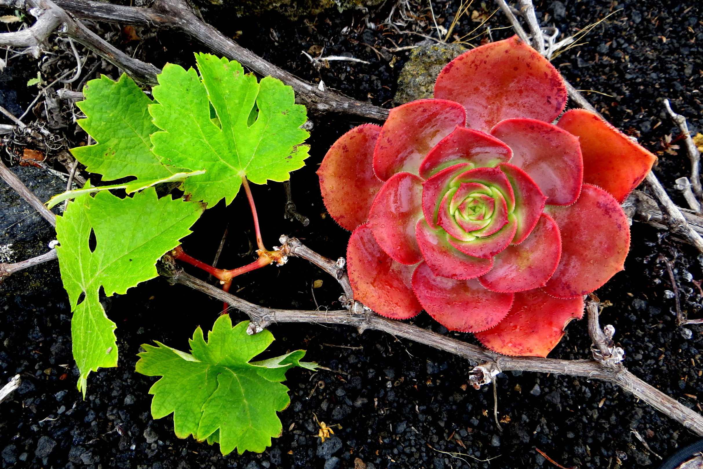Hauswurz und Weinreben wachsen am Rand des Vulkans