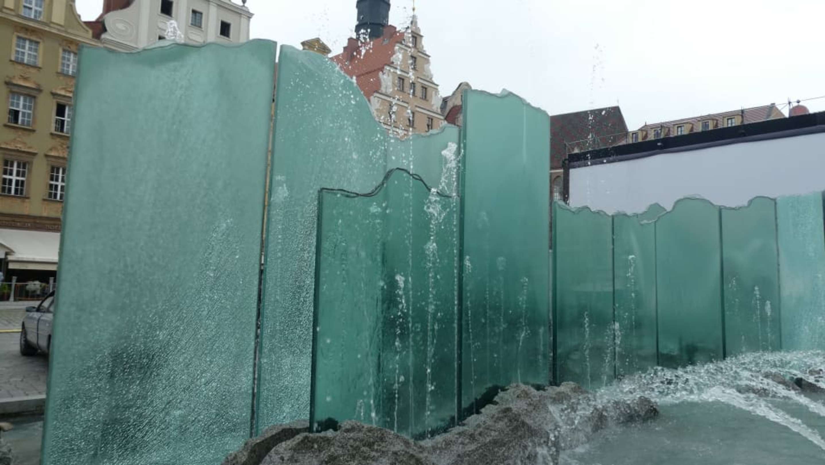 Moderner Brunnen vor historischen Gebäuden