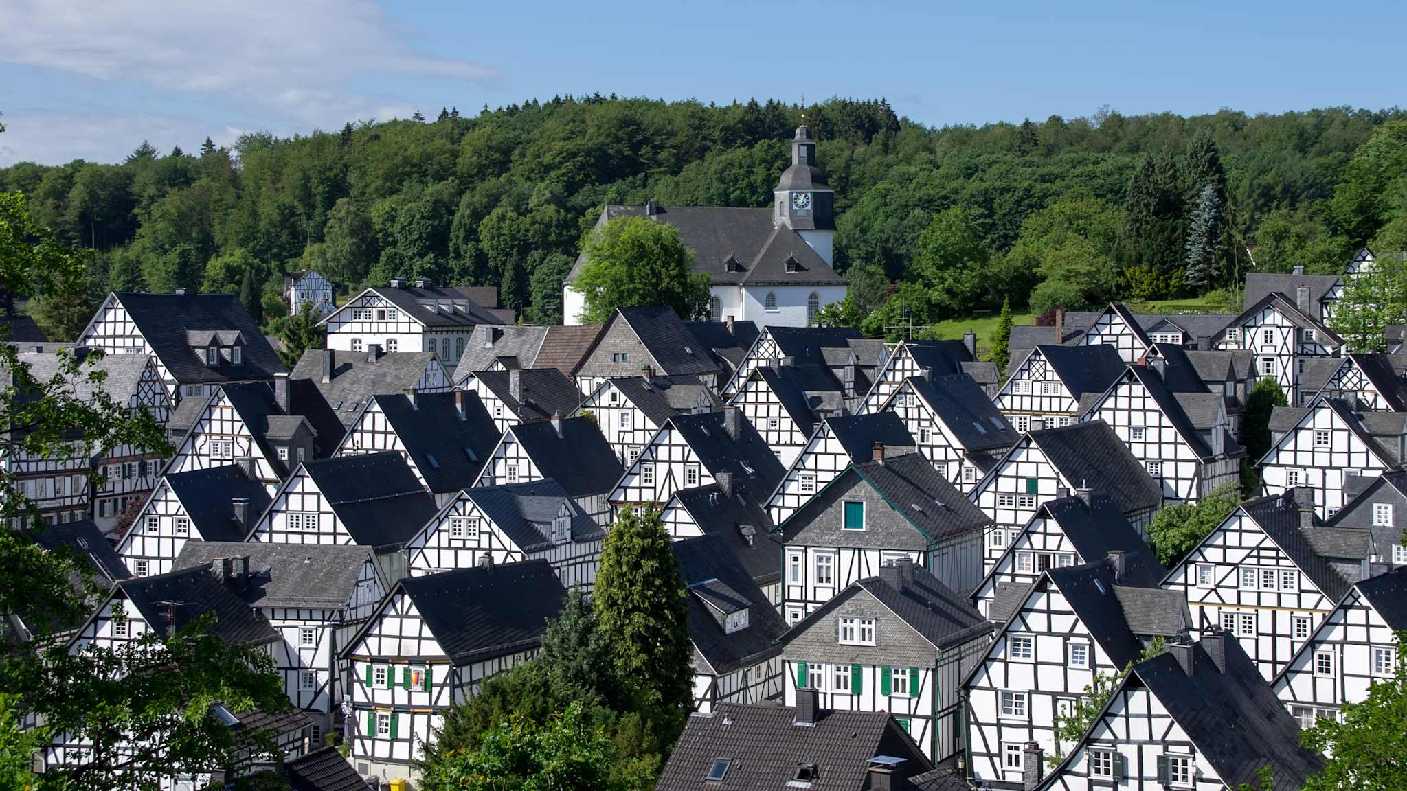 Freudenberg ist vor allem für ein einziges Bild berühmt – und das hat weltweite Strahlkraft: der „Alte Flecken“. Der historische Stadtkern besteht fast ausschließlich aus schwarz-weißen Fachwerkhäusern, die nach einem Brand im 17. Jahrhundert planmäßig wiederaufgebaut wurden. Von oben betrachtet wirkt das Ensemble wie eine Schachbrettlandschaft – ein Anblick, den Du so nirgendwo sonst findest. Wenn Du durch die Gassen gehst, erlebst Du, wie eng Tradition und Alltag hier zusammengehören: kleine Geschäfte, gemütliche Cafés und Ausstellungen rund ums Fachwerk. Am besten genießt Du den Blick vom Aussichtspunkt „Kuhlenberg“.